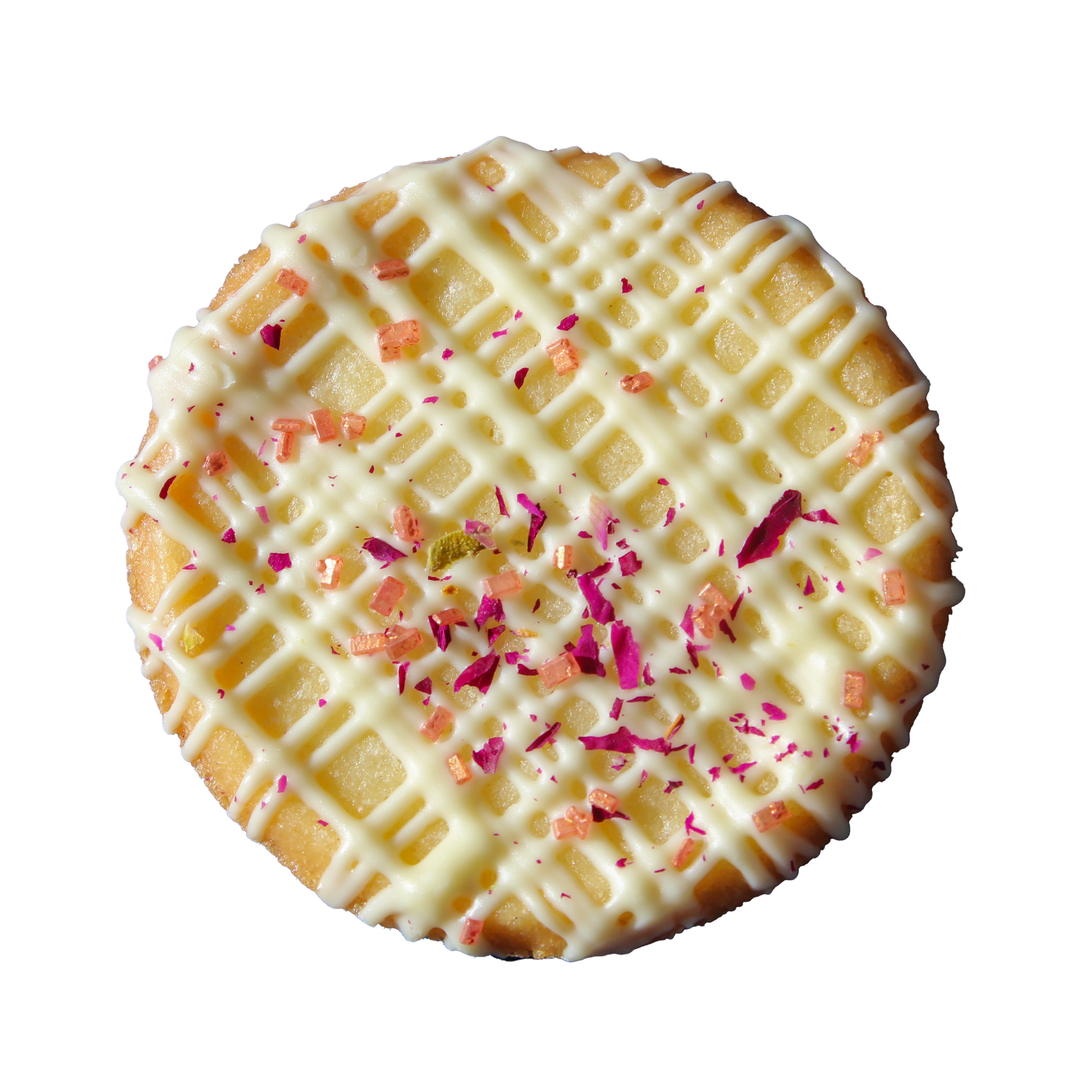 A french vanilla shortbread cookie topped with creamy white chocolate and rose petals